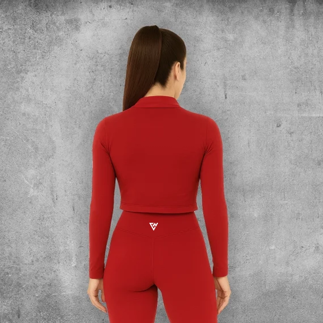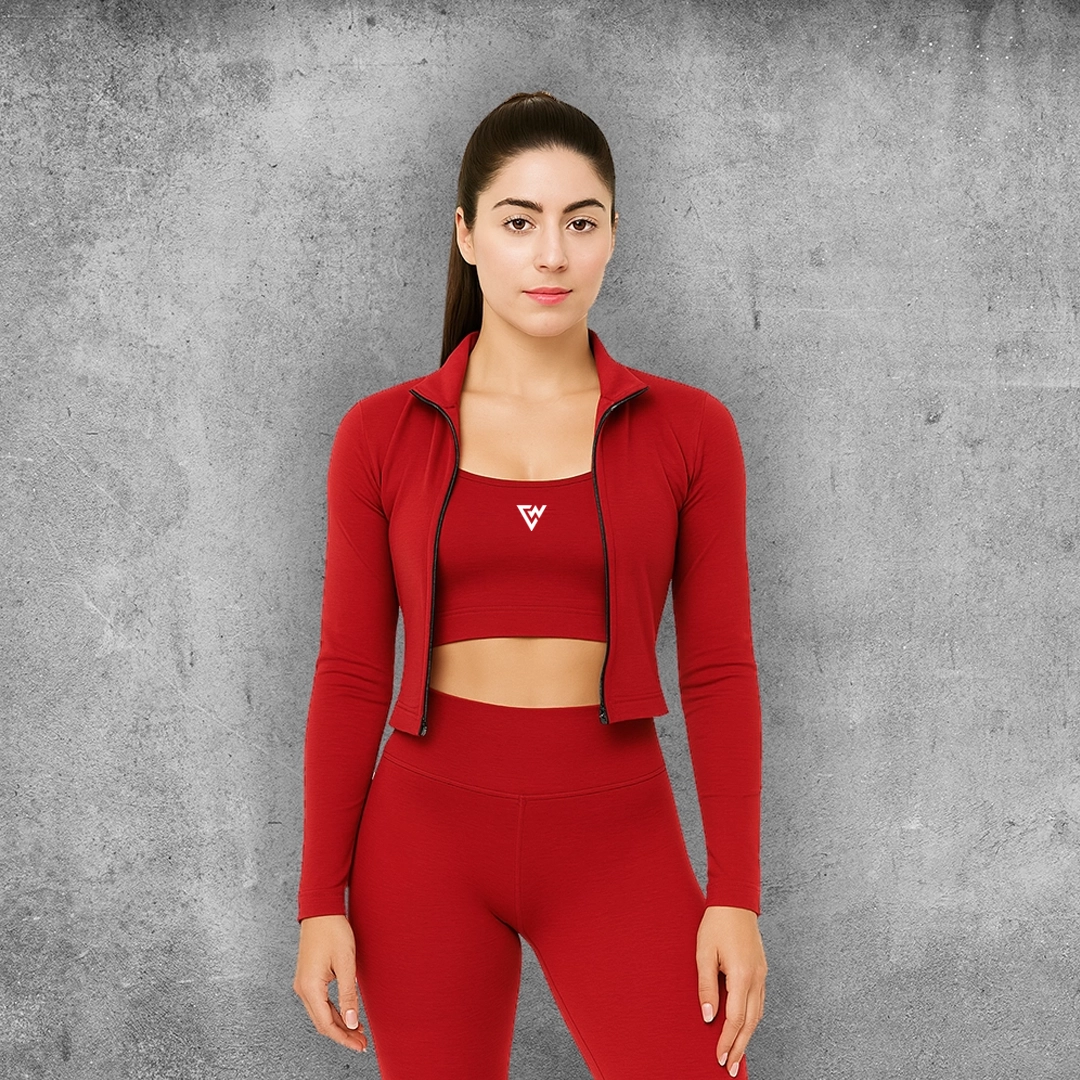 If you are searching for a fashionable and functional red activewear set, sports bra and leggings set, or gym wear with jacket, this outfit is an excellent option for training and daily active styling.