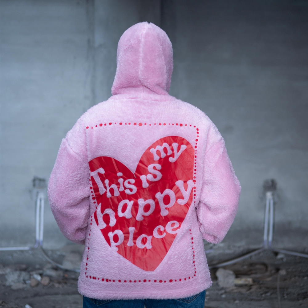 The oversized, unisex fit delivers effortless comfort, while the soft pastel pink adds a cute aesthetic that stands out. On the back, the signature red heart artwork “This is my happy place” makes the hoodie not just warm, but emotionally expressive and mood-lifting. Whether you’re lounging at home, stepping out casually, or gifting someone special, this hoodie is guaranteed to bring joy, comfort, and a stylish winter vibe.